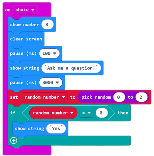 If the random number variable is set to 0, the show string (output) “Yes” is shown on the micro:bit.