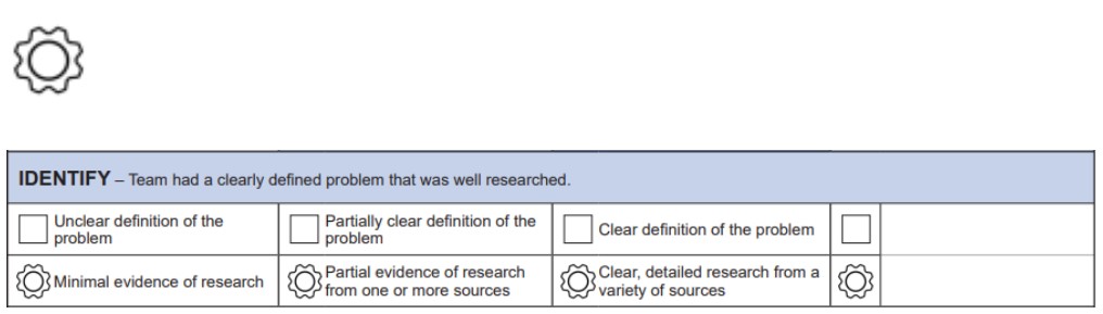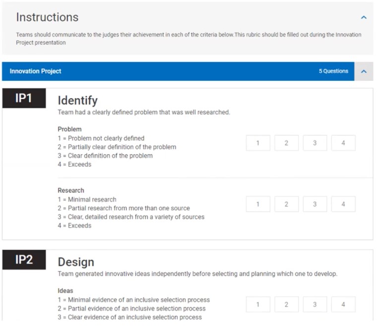 All scoring in the Innovation Project section is done against the judging rubrics and completed on the online Event Hub system. Sample questions will also be provided to judging teams to help you tease out the information you need to score them in all areas.
