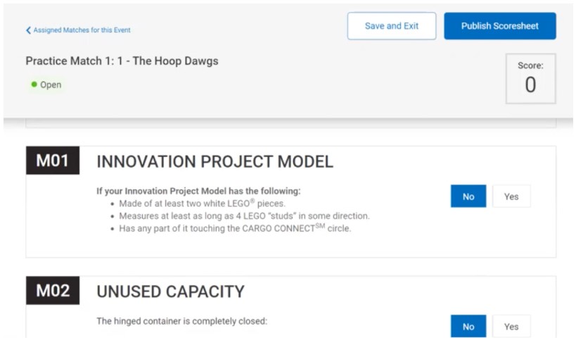 The Robot Game also uses the Event Hub and is a similar process, although you can complete the scoring sheet while the team is present so you can discuss with them how they did and make sure they agree with the decisions made. The system will award all the correct marks for you as you tick ‘No/Yes’ for whether each mission has been achieved. It will also total up their final score for you.