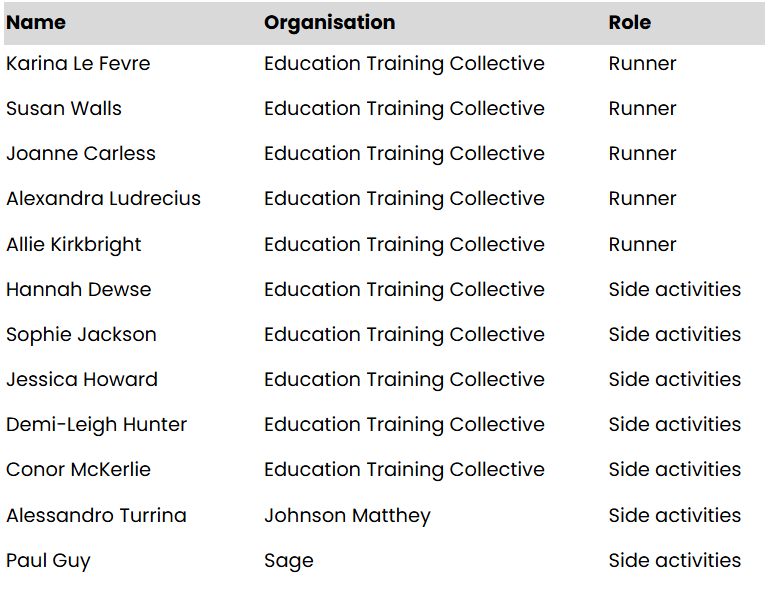 Our support volunteers and runners will be: