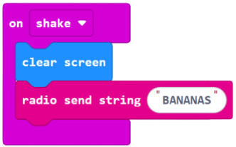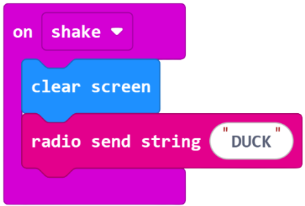 When the shake input is received it will clear the screen on micro:bit A so the duck is gone. Then we’ll send a radio message. A string is just a collection of letters or numbers. Type ‘Duck’ in the box. This is the sending part of the code.